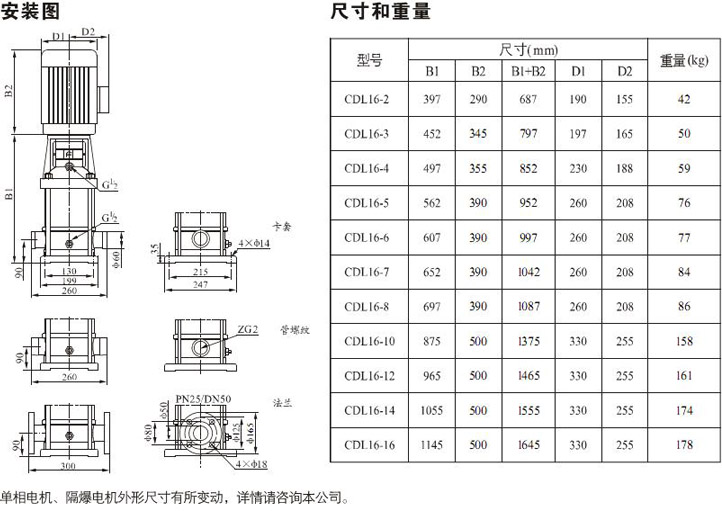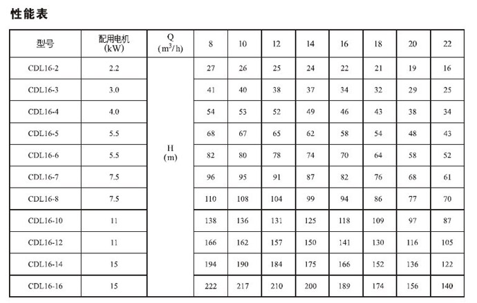 產品介紹 CDL/CDLF16-16FSWSC 不銹鋼高壓沖洗泵是一種多功能產品,可以輸送從自來水到工業液體的各種不同介質,適應于不同溫度、流量和壓力范圍,CDL適用于無腐蝕性液體,CDLF適用于輕度腐蝕性液體。 水:水廠過濾與輸送、水廠分區送水、主管增壓、高層建筑增壓。 工業增壓:流程水系統、清洗系統、高壓沖洗系統、消防系統。 工業液體輸送:冷卻和空調系統、鍋爐給水和冷凝系統、機床配套、酸和堿。 水處理:超濾系統、反滲透系統、蒸餾系統、分離器、游泳池。 灌溉:農田灌溉、噴灌、滴灌。 運行條件 稀薄、干凈、非易燃易爆并不含固體顆粒或纖維的液體。 液體溫度:常溫型 -15℃至+70℃ 熱水型 -15℃至+120℃ 環境溫度:最高+40℃ 海拔:最高1000m CDL/CDLF16-16FSWSC 不銹鋼高壓沖洗泵為安裝標準電機的非自吸式多級離心泵,電機軸通過泵頭用軸聯器直接與泵軸連接,拉桿螺栓將耐壓筒、過流部件固定在泵頭和進出水段之間,泵進出水口在泵底同一直線上;本泵可根據需要配置智能保護器,對泵干轉、缺相、過載等進行有效保護。 電機 電機為全封閉,風冷式二極標準電機。 防護等級:IP55 絕緣等級:F 標準電壓, 50Hz ![]() ![]() ![]() 因產品生產批次、型號不同,產品圖片及安裝尺寸僅供參考,詳情可聯系我們的銷售人員了解更多CDL/CDLF16-16FSWSC 不銹鋼高壓沖洗泵相關信息!
