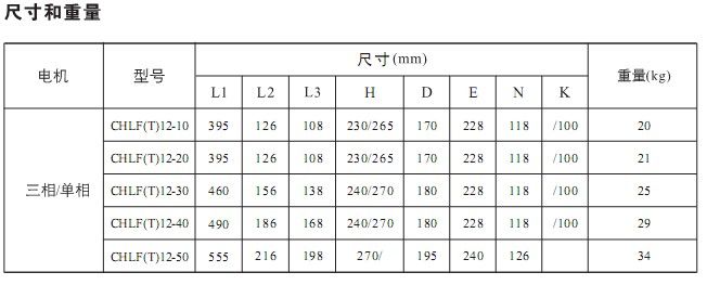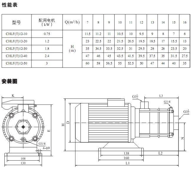 產(chǎn)品介紹 CHLF(T)12-10臥式節(jié)段式多級離心泵非自吸離心泵是渤泉泵業(yè)制造有限公司制造的主導產(chǎn)品,配加長軸電機采用了免修機械密封,緊湊式結(jié)構(gòu)使泵尺寸很小,軸向入口和徑向出口。輕型段式多級離心泵的過流部件均采用不銹鋼材料(304或316)制成,輕型不銹鋼多級離心泵具有低噪音,耐輕腐蝕,外形美觀、體積小、重量輕、使用壽命長等特點,不同材質(zhì)的硬質(zhì)合金密封,保證了不同介質(zhì)輸送均無泄漏;噪音低:兩個低噪音軸承下的水泵,運轉(zhuǎn)平穩(wěn),除電機微弱聲響,基本無噪聲;故障率低:結(jié)構(gòu)簡單合理,整機無故障工作時間大大提高。采用國內(nèi)優(yōu)秀水力模型優(yōu)化設(shè)計而成,是理想的新一代高效節(jié)能輕型臥式多級離心泵。采用了免修機械密封。輕型段式多級離心泵的過流部件均采用不銹鋼材料(304或316)制成,具有低噪音,耐輕腐蝕,外形美觀、體積小、重量輕、使用壽命長等特點。 二、應(yīng)用范圍: CHLF(T)12-10臥式節(jié)段式多級離心泵主要用于家庭型中央空調(diào)循環(huán)及工業(yè)上液體的傳輸。如脫礦物質(zhì)水、軟水、凈化系統(tǒng)、輕油等的循環(huán)和增壓。 1)小型中央空調(diào)循環(huán) 2)冷卻系統(tǒng) 3)工業(yè)清洗 4)水處理(水的凈化) 5)水產(chǎn)養(yǎng)殖 6)施肥/計量系統(tǒng) 7)環(huán)境應(yīng)用 三、工作條件: 稀薄、干凈、不凝、不爆炸、不含固體顆?;蚶w維的液體。 液體溫度: 常溫型-15℃至+70℃ 熱水型+70℃至+110℃ 最大環(huán)境溫度:+40℃ 最大運作壓力:10巴 最大進口壓力受最大運作壓力限制 介質(zhì)酸堿性:PH4~9 四、輸送液體: 1、稀薄、清潔、不含固體顆?;蚶w維的非易燃易爆液體。 2、泵可以輸送諸如礦泉水、軟化水、純水、清油和其它輕化工介質(zhì)。 3、當輸送液體的密度或粘度大于水,如需要,必須配用大功率電機。 4、泵是否適用于某一特定液體由多種因素決定,其中最重要的是氯含量、PH值、溫度和溶濟、油的含量等。 五、曲線條件: 下述條件適用于后面所示性能曲線。 1、所有曲線都基于電機在恒速2900rpm的測量值。 2、曲線容差符合ISO9906,附錄A。 3、測試采用20℃不含空氣的水,運動粘度為1mm2/s。 4、泵的使用參照加粗曲線的性能范圍,以防流量過小產(chǎn)生過熱和流量過大使電機過載等。 六、電機: 輕型段式多級離心泵電機為全封閉,風冷式二極電機 防護等級:IP55 絕緣等級:F 標準電壓, 50Hz: 1×220-240V 3×220-240V 380-415V