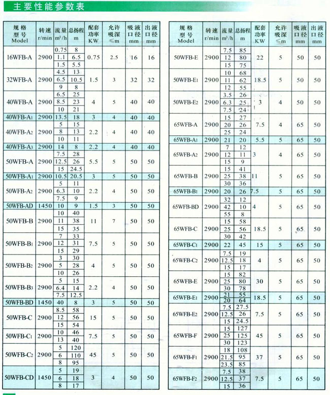 產品介紹 16WFB-A系列無密封自控自吸泵采用無泄漏V型密封總成,革除了傳統水泵的填料密封、盤根密封、機械密封,徹底制服了“跑、冒、滴、漏”,是代替原各種長軸液下泵、潛水泵、潛污泵等最理想的設備。 該結構泵缺點:一、停機液體沿軸方向往外泄漏,對于頻繁起動設備的場合不太適合;二、副葉輪消耗的功率太大、水泵效率低。WFB改進型結構為有密封裝置,一是提高水泵效率,二是降低電機功率,三是抑制了水泵停機泄漏現象。 運動過程中密封裝置不摩擦、無磨損,使用壽命較同類產品長10倍以上。移植真空泵原理、自吸性能穩定可靠,特別是采用“電動空氣控制閥”真正實現了“一次引流,終身自吸”。效率高、振動小、噪音低、移動靈活、拆卸簡便、易于安裝、不需地腳固定,免去了長軸液下泵運輸,安裝、維修等困難。具有優越的自控功能,可與高科技領域和高度自動化系列統配套使用。 產品特點 1.該泵密封可靠,采用無泄漏密封裝置,具體由動力密封和輔助密封組成。替代了傳統水泵的填料密封、機械密封,徹底解決了傳統密封的‘‘跑、冒、滴、漏’’等問題。是替代原長軸液下泵、潛水泵、潛污泵等最理想產品。 2.該自吸泵運行過程中密封裝置不摩擦、無磨損,使用壽命較傳統產品長1 O倍以上。移植真空泵原理自吸性能穩定可靠,特別是采用“電動空氣控制閥”真正實現了首次引流,永久自吸,該泵機組振動小、噪音低、移動靈活、拆裝方便。具有優越的自控功能、可與相關控制系統配套實現高度自動化。 該泵有圓錐型、長方型、防爆型、戶外型、推車移動型。可根據現場的安裝空間進行選擇余地,防爆型適用于易燃、易爆環境、戶外型配套戶外電機、可在露天場合情況下使用,推車移動型,將水泵推移到您所需要的任何工作場地。 型號意義 ![]() 產品用途 WFB型無密封自控自吸泵廣泛適用于市政排污工程、河塘養殖、電力、化工、冶金、醫藥、食品、消防、環保、電鍍、凈水、市政、國防、紡織、造紙、采礦、建筑等行業。 使用范圍 WFB系列無密封自控自吸泵具有耐溫、耐壓、耐磨、“一次引流”、“終身自吸”等多種功能。目前生產襯四氟、氯化聚醚、超高分子聚乙烯、聚丙烯、不銹鋼、鑄鋼、生鐵等多種材質。WFB型無密封自控自吸泵廣泛適用于電子、電力、化工、冶金、醫藥、食品、電鍍、環保、消防、市政、凈水、國防軍工、紡織印染、采掘選礦等行業。 結構說明 無密封自控自吸泵共分五種型號:1型為長方型無密封自控自吸泵,2型為圓錐型無密封自控自吸泵,3型為防爆型無密封自控自吸泵,4型為戶外型無密封自控自吸泵,5型為推車移動型無密封自控自吸泵 無密封自控自吸泵流量設計從0.75—6850m3/h、揚程5m—132m、吸液口徑16—800 mm、出液口徑10—600 mm 。 ![]() 因產品生產批次、型號不同,產品圖片及安裝尺寸僅供參考,詳情可聯系我們的銷售人員了解更多16WFB-A 無密封自控自吸泵相關信息!