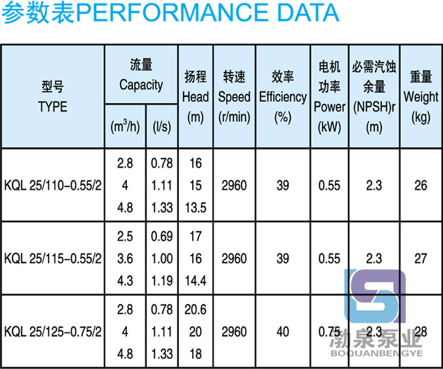 產品介紹 KQL25/110-0.55/2 立式單級管道泵供輸送不含固體顆粒的清水及物理化學性質類似于水的液體之用。同時根據使用溫度、介質等不同在ISG型管道離心泵基礎上派出適用熱水、高溫、腐蝕性化工泵、油泵。該產品具有同效節能、噪音低、性能穩定等特點。 用途: KQL25/110-0.55/2 立式單級管道泵用于空調、采暖、衛生用水、水處理冷卻冷凍系統、液體循環和供水、增壓及灌溉等領域中無腐蝕的冷水和熱水輸送。 工作條件: 轉速:2960r/min,1480r/min或980r/min 流量范圍:1.8~2000m3/h 揚程:≤127m 介質溫度:-10℃~120℃ 環境溫度:最大+40℃;海拔高度小于1000m;相對濕度不超過95% 材質: 泵殼、泵蓋、葉輪:鑄鐵 泵軸:45#鋼鍍鉻或不銹鋼(2Cr13) 機械密封動、靜環:浸銻石墨、碳化硅 結構:結構緊湊的單級泵,適用于現代建筑物。 產品特點: KQL25/110-0.55/2 立式單級管道泵結構緊湊、合理,泵與電機直接連接,外形美觀,占地面積小效率高,閉式鑄鐵葉輪,軸承配置合理,葉輪懸臂短,機泵軸完全同心,泵運行平穩、可靠,噪音低壽命長,強制環流沖洗機械密封,免保養、無滲漏。 管道泵選型指南: 例如:KQL80/160-7.5/2 或KQW80/160-7.5 KQL標準立式單級離心泵,KQW標準臥式單級離心泵 80進出口直徑 160葉輪名義直徑 7.5/2電機功率/電機極數 ![]() ![]() ![]() 因產品生產批次、型號不同,產品圖片及安裝尺寸僅供參考,詳情可聯系我們的銷售人員了解更多KQL25/110-0.55/2 立式單級管道泵相關信息!