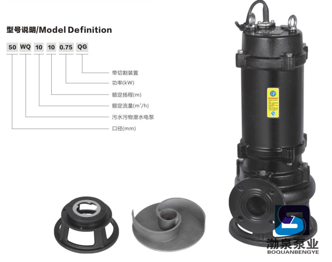 65WQ25-14-2.2QG 雙絞刀潛水排污泵主要用于排送生活廢水、污水、人糞尿及含有短纖維紙屑、木屑、淀粉、泥沙、礦石粒等固體懸浮物和非腐蝕性介質,被抽送液體溫度不超過40℃,密度不大于1200kg/m3,ph值~9。該電泵采用雙端面機械密封和旋轉葉輪,葉輪采用不銹鋼、耐磨損、不堵塞、不纏繞、具有體積小、結構緊湊、攜方便等優點。 適用范圍 65WQ25-14-2.2QG 雙絞刀潛水排污泵主要用于工程污水,生活污水。 如: (1)用于建筑工地、工程基礎施工、市政設施、自來水廠。 (2)各種高樓大廈的地下室、人防坑洞、地鐵等地下層污水排放。 (3)中小型企業污水處理及循環水輸送。 (4)食品、造紙、釀造、鋼鐵及有色金屬、制革、紡織、制藥、水泥廠等廠礦企業的渣漿液抽送。 (5)養雞場,養豬場,各種養殖業,魚池作抽水清塘、增氧,化糞池等各種場合的人畜糞尿抽送等作用。 注:WQ/QG主要性能及數據除不帶切割裝置外,其內部結構均同WQ/QG型。  型號 | 流量m3/h | 揚程m | 電壓(V) | 重量(KG) | 50WQ10-10-0.75QG | 10 | 10 | 220/380 | 29 | 65WQ15-7-0.75QG | 15 | 7 | 220/380 | | 50WQ10-13-1.1QG | 10 | 13 | 220/380 | 30 | 65WQ15-10-1.1QG | 15 | 10 | 220/380 | | 50WQ15-15-1.5QG | 15 | 15 | 220/380 | 33 | 65WQ25-10-1.5QG | 25 | 10 | 380 | 34 | 50WQ15-20-2.2QG | 15 | 20 | 380 | 39 | 50WQ20-16-2.2QG | 20 | 16 | 380 | 39 | 65WQ25-14-2.2QG | 25 | 14 | 380 | 41 | 80WQ40-9-2.2QG | 40 | 9 | 380 | 46 | 50WQ15-25-3QG | 15 | 25 | 380 | 44 | 65WQ25-18-3QG | 25 | 18 | 380 | 46 | 80WQ30-15-3QG | 30 | 15 | 380 | 51 | 80WQ40-13-3QG | 40 | 13 | 380 | 51 | 50WQ15-32-4QG | 15 | 32 | 380 | 66 | 50WQ25-28-4QG | 25 | 28 | 380 | 66 | 65WQ30-20-4QG | 30 | 20 | 380 | 69 | 65WQ40-17-4QG | 40 | 17 | 380 | 69 | 80WQ40-15-4QG | 40 | 15 | 380 | 72 | 100WQ50-12-4QG | 50 | 12 | 380 | 75 | 100WQ80-8-4QG | 80 | 8 | 380 | 75 | 50WQ18-35-5.5QG | 18 | 35 | 380 | 70 | 65WQ40-25-5.5QG | 40 | 25 | 380 | 72 | 80WQ50-20-5.5QG | 50 | 20 | 380 | 76 | 100WQ65-15-5.5QG | 65 | 15 | 380 | 80 | 50WQ20-43-7.5QG | 20 | 43 | 380 | | 65WQ30-35-7.5QG | 30 | 35 | 380 | | 80WQ45-22-7.5QG | 45 | 22 | 380 | | 100WQ70-17-7.5QG | 70 | 17 | 380 | | 150WQ140-10-7.5QG | 140 | 10 | 380 | | 100WQ100-25-11QG | 100 | 25 | 4極電機 | | 150WQ180-11-11QG | 180 | 11 | 4極電機 | | 200WQ210-9-11QG | 210 | 9 | 4極電機 | | 100WQ100-30-15QG | 100 | 30 | 4極電機 | | 150WQ180-15-15QG | 180 | 15 | 4極電機 | | 200WQ250-11-15QG | 250 | 11 | 4極電機 | |
