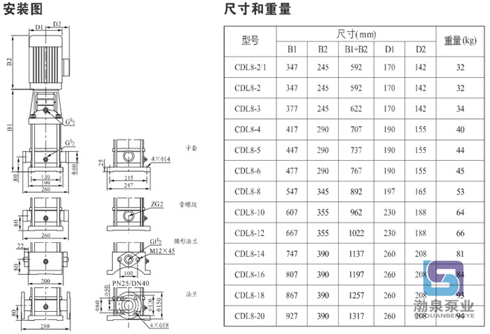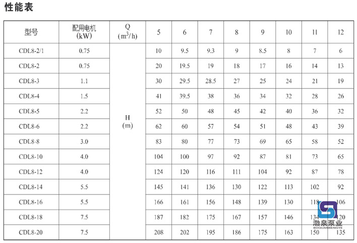 產品介紹 CDLF8-6FSWSC 立式不銹鋼多級離心泵是一種多功能產品,可以輸送從自來水到工業液體的各種不同介質,CDLF8-6FSWSC 立式不銹鋼多級離心泵適應于不同溫度、流量和壓力范圍,CDL不銹鋼多級泵適用于無腐蝕性液體,CDLF適用于輕度腐蝕性液體。 水:水廠過濾與輸送、水廠分區送水、主管增壓、高層建筑增壓。 工業增壓:流程水系統、清洗系統、高壓沖洗系統、消防系統。 工業液體輸送:冷卻和空調系統、鍋爐給水和冷凝系統、機床配套、酸和堿。 水處理:超濾系統、反滲透系統、蒸餾系統、分離器、游泳池。 灌溉:農田灌溉、噴灌、滴灌。 運行條件 稀薄、干凈、非易燃易爆并不含固體顆粒或纖維的液體。 液體溫度:常溫型 -15℃至+70℃ 熱水型 -15℃至+120℃ 環境溫度:最高+40℃ 海拔:最高1000m CDLF8-6FSWSC 立式不銹鋼多級離心泵為安裝標準電機的非自吸式多級離心泵,電機軸通過泵頭用軸聯器直接與泵軸連接,拉桿螺栓將耐壓筒、過流部件固定在泵頭和進出水段之間,泵進出水口在泵底同一直線上;本泵可根據需要配置智能保護器,對泵干轉、缺相、過載等進行有效保護。 電機 電機為全封閉,風冷式二極標準電機。 防護等級:IP55 絕緣等級:F 標準電壓, 50Hz 因產品生產批次、型號不同,產品圖片及安裝尺寸僅供參考,詳情可聯系我們的銷售人員了解更多CDLF8-6FSWSC 立式不銹鋼多級離心泵相關信息!