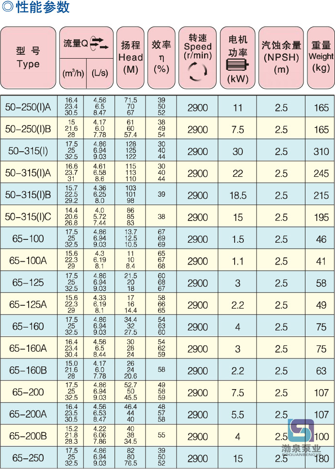 產(chǎn)品介紹 ISW50-250(I)A 臥式管道離心泵是采用IS型離心泵之性能參數(shù),在一般臥式泵的基礎上進行巧妙組合設計而成,同時根據(jù)使用溫度、介質(zhì)等不同在ISW型管道泵基礎上派生出適用熱水泵、高溫、耐腐蝕化工泵、油泵。該系列產(chǎn)品具有高效節(jié)能、噪音低、性能可靠等優(yōu)點,符合JB/T53058-93的標準要求,產(chǎn)品按ISO2858標準設計制造。具有效率高、流量及揚程范圍大、結(jié)構(gòu)合理、成本低、壽命長、占地面積小、安裝維修方便等特點。是替代IS、DL等常規(guī)產(chǎn)品的新離心泵,特別適用于高層建筑的給排水、噴灌、冶金、市政、礦山水處理排污,食品、化工、空調(diào)及其他行業(yè)輸送水、化學介質(zhì)及其他液體。 ISW50-250(I)A 臥式管道離心泵流量范圍15~1200m3 /h,分基本型、擴流型、A、B、C切割型等250多種規(guī)格,并根據(jù)流體介質(zhì)和溫度不同又派生出清水泵、熱水泵、化工泵、防爆油泵、防爆化工泵等系列產(chǎn)品。 ISW50-250(I)A 臥式管道離心泵主要用途 1、ISW臥式清水泵供輸送清水及物理化學性質(zhì)類似于清水的其它液體之用,適用于工業(yè)和城市給排水、高層建筑增壓送水、園林噴灌、消防增壓、遠距離輸送、暖通制冷循環(huán)、浴室等冷暖水循環(huán)增壓及設備配套,使用溫度T≤80℃。 2、ISWR臥式熱水泵,廣泛適用于:冶金、化工、紡織、造紙以及賓館飯店等鍋爐熱水增壓循環(huán)輸送及城市采暖系統(tǒng),ISWR型使用溫度T≤120℃。 3、ISWH臥式化工泵,供輸送不含固體顆粒,具有腐蝕性。粘度類似于水的液體,適用于石油、化工、冶金、電力、造紙、食品、制藥和合成纖維等部門,使用溫度為-20℃~+120℃。 4、ISWY臥式管道油泵,供輸送汽油、煤油、柴油等油類產(chǎn)品或易燃、易爆液體,被輸送介質(zhì)溫度為-20℃~120℃。 5、ISWHY型臥式不銹鋼防爆化工離心泵,適用于輸送易燃性化工液體。 6、ISWD臥式低轉(zhuǎn)速泵,適應要求環(huán)境噪聲很低的場合,使用溫度T≤120℃。 ISW50-250(I)A 臥式管道離心泵工作條件 1.吸入壓力≤1.0MPa,或泵系統(tǒng)最高工作壓力≤1.6MPa,即吸入口壓力+泵揚程≤1.6MPa、泵靜壓試驗壓力為≤2.5MPa,訂貨時請注明系統(tǒng)工作壓力。泵系統(tǒng)工作壓力大于1.6MPa時應在訂貨時另行提出,以便在制造時泵的過流部分和聯(lián)接部分采用鑄鋼材料。 2.環(huán)境溫度<40℃,相對濕度<40%。 3.所輸送介質(zhì)中固體顆粒體積含量不超過單位體積的0.1,粒度<0.2mm。 注:如果用介質(zhì)為帶有細小顆粒,請在訂貨時說明,以便廠家采用耐磨式機械密封。 ISW50-250(I)A 臥式管道離心泵產(chǎn)品特點 運行平穩(wěn):泵軸的絕對同心度及葉輪優(yōu)異的動靜平衡,保證平穩(wěn)運行,絕無振動。 滴水不漏:不同材質(zhì)的硬質(zhì)合金密封,保證了不同介質(zhì)輸送均無泄漏。 噪音低:兩個低噪音軸承支撐下的水泵,運轉(zhuǎn)平穩(wěn),除電機微弱聲響,基本無噪音。 故障率低:結(jié)構(gòu)簡單合理,關鍵部分采用品質(zhì)配套,整機無故障工作時間大大提高。 維修方便:更換密封、軸承,簡易方便。 占地更?。撼隹诳上蜃?、向右、向上三個方向,便于管道布置安裝,節(jié)省空間。 ![]() ![]() ![]() 因產(chǎn)品生產(chǎn)批次、型號不同,產(chǎn)品圖片及安裝尺寸僅供參考,詳情可聯(lián)系我們的銷售人員了解更多ISW50-250(I)A 臥式管道離心泵相關信息!
