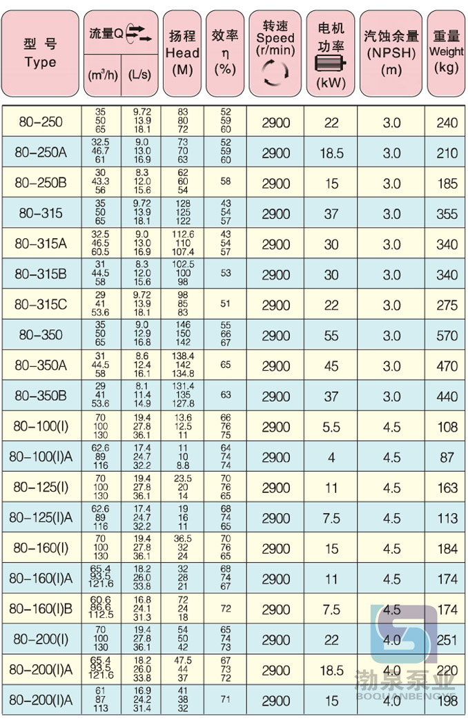 產品介紹 ISW80-250A 臥式單級單吸離心泵是采用IS型離心泵之性能參數,在一般臥式泵的基礎上進行巧妙組合設計而成,同時根據使用溫度、介質等不同在ISW型管道泵基礎上派生出適用熱水泵、高溫、耐腐蝕化工泵、油泵。該系列產品具有高效節能、噪音低、性能可靠等優點,符合JB/T53058-93的標準要求,產品按ISO2858標準設計制造。具有效率高、流量及揚程范圍大、結構合理、成本低、壽命長、占地面積小、安裝維修方便等特點。是替代IS、DL等常規產品的新離心泵,特別適用于高層建筑的給排水、噴灌、冶金、市政、礦山水處理排污,食品、化工、空調及其他行業輸送水、化學介質及其他液體。 ISW80-250A 臥式單級單吸離心泵流量范圍15~1200m3 /h,分基本型、擴流型、A、B、C切割型等250多種規格,并根據流體介質和溫度不同又派生出清水泵、熱水泵、化工泵、防爆油泵、防爆化工泵等系列產品。 ISW80-250A 臥式單級單吸離心泵主要用途 1、ISW臥式清水泵供輸送清水及物理化學性質類似于清水的其它液體之用,適用于工業和城市給排水、高層建筑增壓送水、園林噴灌、消防增壓、遠距離輸送、暖通制冷循環、浴室等冷暖水循環增壓及設備配套,使用溫度T≤80℃。 2、ISWR臥式熱水泵,廣泛適用于:冶金、化工、紡織、造紙以及賓館飯店等鍋爐熱水增壓循環輸送及城市采暖系統,ISWR型使用溫度T≤120℃。 3、ISWH臥式化工泵,供輸送不含固體顆粒,具有腐蝕性。粘度類似于水的液體,適用于石油、化工、冶金、電力、造紙、食品、制藥和合成纖維等部門,使用溫度為-20℃~+120℃。 4、ISWY臥式管道油泵,供輸送汽油、煤油、柴油等油類產品或易燃、易爆液體,被輸送介質溫度為-20℃~120℃。 5、ISWHY型臥式不銹鋼防爆化工離心泵,適用于輸送易燃性化工液體。 6、ISWD臥式低轉速泵,適應要求環境噪聲很低的場合,使用溫度T≤120℃。 ISW80-250A 臥式單級單吸離心泵工作條件 1.吸入壓力≤1.0MPa,或泵系統最高工作壓力≤1.6MPa,即吸入口壓力+泵揚程≤1.6MPa、泵靜壓試驗壓力為≤2.5MPa,訂貨時請注明系統工作壓力。泵系統工作壓力大于1.6MPa時應在訂貨時另行提出,以便在制造時泵的過流部分和聯接部分采用鑄鋼材料。 2.環境溫度<40℃,相對濕度<40%。 3.所輸送介質中固體顆粒體積含量不超過單位體積的0.1,粒度<0.2mm。 注:如果用介質為帶有細小顆粒,請在訂貨時說明,以便廠家采用耐磨式機械密封。 ISW80-250A 臥式單級單吸離心泵產品特點 運行平穩:泵軸的絕對同心度及葉輪優異的動靜平衡,保證平穩運行,絕無振動。 滴水不漏:不同材質的硬質合金密封,保證了不同介質輸送均無泄漏。 噪音低:兩個低噪音軸承支撐下的水泵,運轉平穩,除電機微弱聲響,基本無噪音。 故障率低:結構簡單合理,關鍵部分采用品質配套,整機無故障工作時間大大提高。 維修方便:更換密封、軸承,簡易方便。 占地更省:出口可向左、向右、向上三個方向,便于管道布置安裝,節省空間。 ![]() ![]() ![]() 因產品生產批次、型號不同,產品圖片及安裝尺寸僅供參考,詳情可聯系我們的銷售人員了解更多ISW80-250A 臥式單級單吸離心泵相關信息!