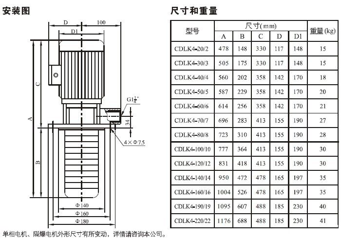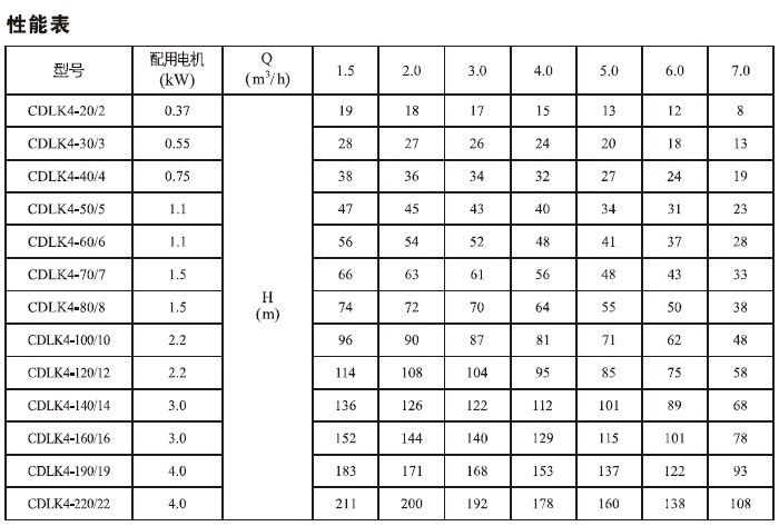 產品介紹 一、概述 CDLKF4-140/14浸入式多級離心泵為安裝標準電機 為滿足水槽或容器的安裝深度,可安裝空腔體來改變泵本身的長度,不同的級數長度見尺寸和重量表和可供產品范圍表。 二、應用范圍 CDLKF4-140/14液下式多級離心泵用于輸送機床冷卻液、潤滑液、冷凝水輸送、工業清洗設備和其它適合浸入式泵使用的場合,適合于不同溫度、流量和壓力范圍,CDLK適用于無腐蝕性液體,CDLKF適于輕度腐蝕性液體。 具體用于電火花、車床、磨床、加工中心、冷卻裝置、工業清洗設備、過濾系統等。 三、電機 電機為全封閉,風冷式二極標準電機。 防護等級:IP55 絕緣等級:F 標準電壓:50HZ:1*220-230/240V 3*200/346V 3*220-240/380-415V 3*220-225/380-440V 其他電壓的電機按要求可供。 單相電壓從0.37-2.2kw可供。 四、運行條件 CDLKF4-140/14浸入式多級離心泵適用于稀薄、干凈、不含固體顆粒和纖維的非易爆液體,可輸送水及冷卻用水溶液和切割潤滑液。 液體溫度:常溫型-15℃~+70℃ 熱水型+70℃~+120℃ ![]() ![]() 因產品生產批次、型號不同,產品圖片及安裝尺寸僅供參考,詳情可聯系我們的銷售人員了解更多CDLKF4-140/14浸入式多級離心泵相關信息!