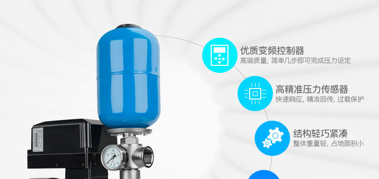 家用智能變頻增壓水泵可視系統壓力變化,由壓力感應器,依感知信號與設定壓力值比較計算,輸出信號給專用變頻器。變頻器再根據傳感器的信號變化,而改變頻率(0-50Hz),馬達泵浦隨頻率之變化而改變馬達轉速以達恒壓功能。
