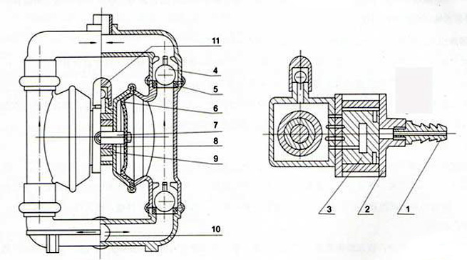 8、結(jié)構(gòu)簡單、易損件少,該泵結(jié)構(gòu)簡單,安裝、維修方便,泵輸送的介質(zhì)不會接觸到配氣閥,聯(lián)桿等運動部件,不象其他類型的泵因轉(zhuǎn)子、活塞、齒輪、葉片等部件的磨損而使性能逐步下降。
