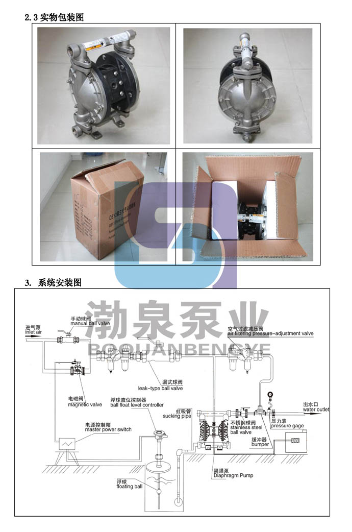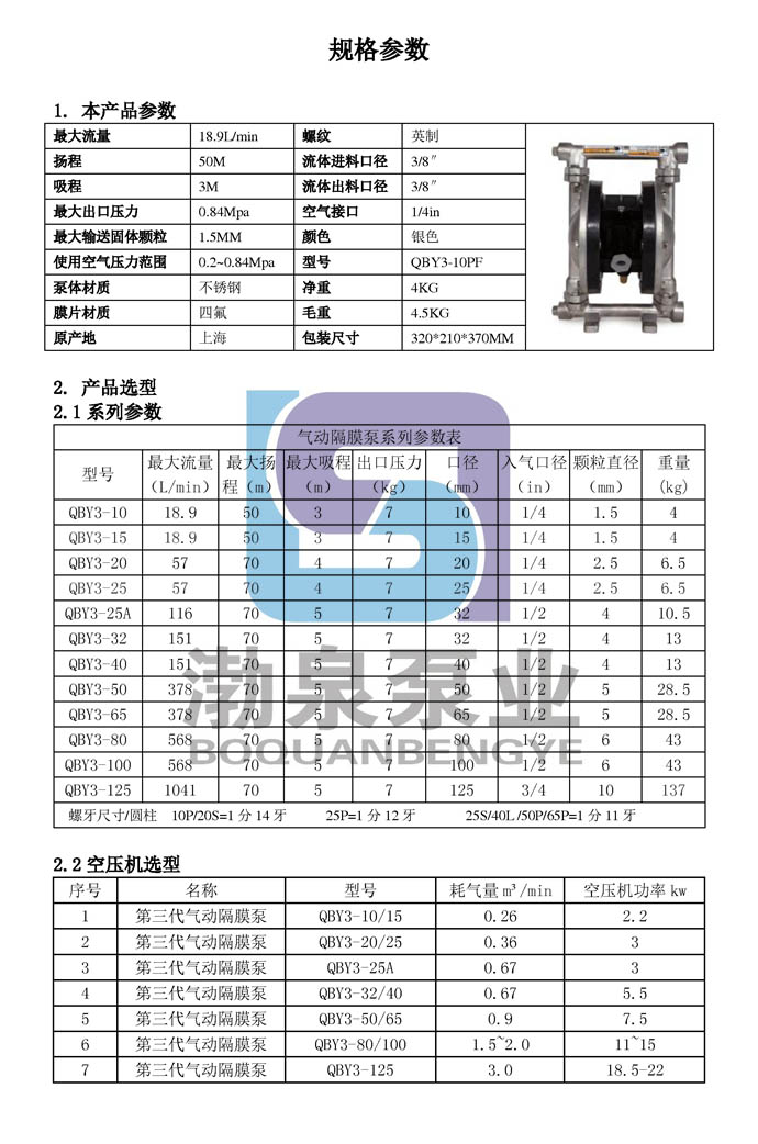 1.產(chǎn)品概述: QBY3系列第三代氣動(dòng)隔膜泵,采用壓縮空氣為動(dòng)力源,是一種由膜片往復(fù)變形造成容積變化的容積泵。具有質(zhì)量可靠、使用壽命長(zhǎng)、噪音底、震動(dòng)小、永不死機(jī)、做工精細(xì)等六大優(yōu)點(diǎn),既能抽送流動(dòng)的液體,又能輸送一些不易流動(dòng)的介質(zhì),具有自吸泵、潛水泵、屏蔽泵、泥漿泵和雜質(zhì)泵等輸送機(jī)械的許多優(yōu)點(diǎn)。 性能特點(diǎn): 1.不需灌引水,吸程高達(dá)5米,揚(yáng)程達(dá)70米,出口壓力≧7bar; 2.流動(dòng)寬敞,通過(guò)性能好,允許通過(guò)最大顆粒直徑達(dá)10毫米。抽送泥漿、雜質(zhì)時(shí),對(duì)泵磨損甚微; 3.揚(yáng)程、流量可通過(guò)氣閥開(kāi)度實(shí)現(xiàn)無(wú)級(jí)調(diào)節(jié)(氣壓調(diào)節(jié)在1-7bar之間); 4.該泵無(wú)旋轉(zhuǎn)部件,沒(méi)有軸封,隔膜等抽送的介質(zhì)與泵的運(yùn)動(dòng)部件、工件介質(zhì)完全隔開(kāi),所輸送的介質(zhì)不會(huì)向外泄漏。所以抽送有毒、易揮發(fā)或腐蝕性介質(zhì)時(shí),不會(huì)造成環(huán)境污染和危害人身安全; 5.不必用電,在易燃、易爆場(chǎng)所使用安全可靠; 6.可以浸沒(méi)在介質(zhì)中工作; 7.使用方便、工作可靠、開(kāi)停只需簡(jiǎn)單地打開(kāi)和關(guān)閉氣體閥門(mén),即使由于意外情況而長(zhǎng)時(shí)間無(wú)介質(zhì)運(yùn)行或突然停機(jī)泵也不會(huì)因此而損壞,一旦超負(fù)荷,泵會(huì)自動(dòng)地停機(jī),具有自我保護(hù)性能,當(dāng)負(fù)荷恢復(fù)正常后,又能自動(dòng)啟動(dòng)運(yùn)行; 8.結(jié)構(gòu)簡(jiǎn)單、易損件少,該泵結(jié)構(gòu)簡(jiǎn)單,安裝、維修方便,泵輸送的介質(zhì)不會(huì)接觸到配氣閥,聯(lián)桿等運(yùn)動(dòng)部件,不像其他類型的泵因轉(zhuǎn)子、活塞、齒輪、葉片等部件的磨損而使性能逐步下降; 9.可輸送較粘的液體(粘度在1萬(wàn)厘泊以下); 10.本泵無(wú)須用油潤(rùn)滑,即使空轉(zhuǎn),對(duì)泵也無(wú)任何影響,這是該泵一大特點(diǎn); 11.塑料法蘭壓力:PN0.6MPa(10bar),金屬法蘭壓力:PN1.0MPa(10bar)。 ![]()