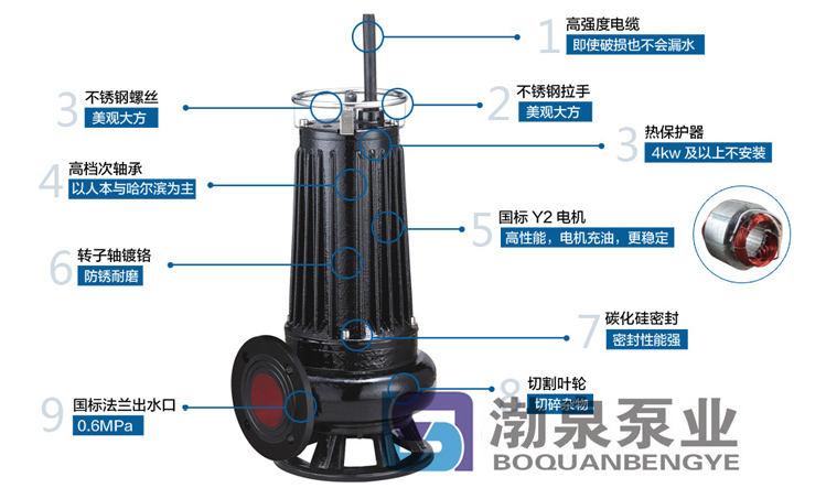 WQX系列污水污物潛水排污泵主要用于排送生活廢水、污水、人糞尿及含有短纖維紙屑、木屑、淀粉、泥沙、礦石粒等固體懸浮物和非腐蝕性介質(zhì),被抽送液體溫度不超過40℃,密度不大于1200kg/m3,ph值~9。該電泵采用雙端面機械密封和旋轉(zhuǎn)葉輪,葉輪采用不銹鋼、耐磨損、不堵塞、不纏繞、具有體積小、結(jié)構(gòu)緊湊、攜方便等優(yōu)點。